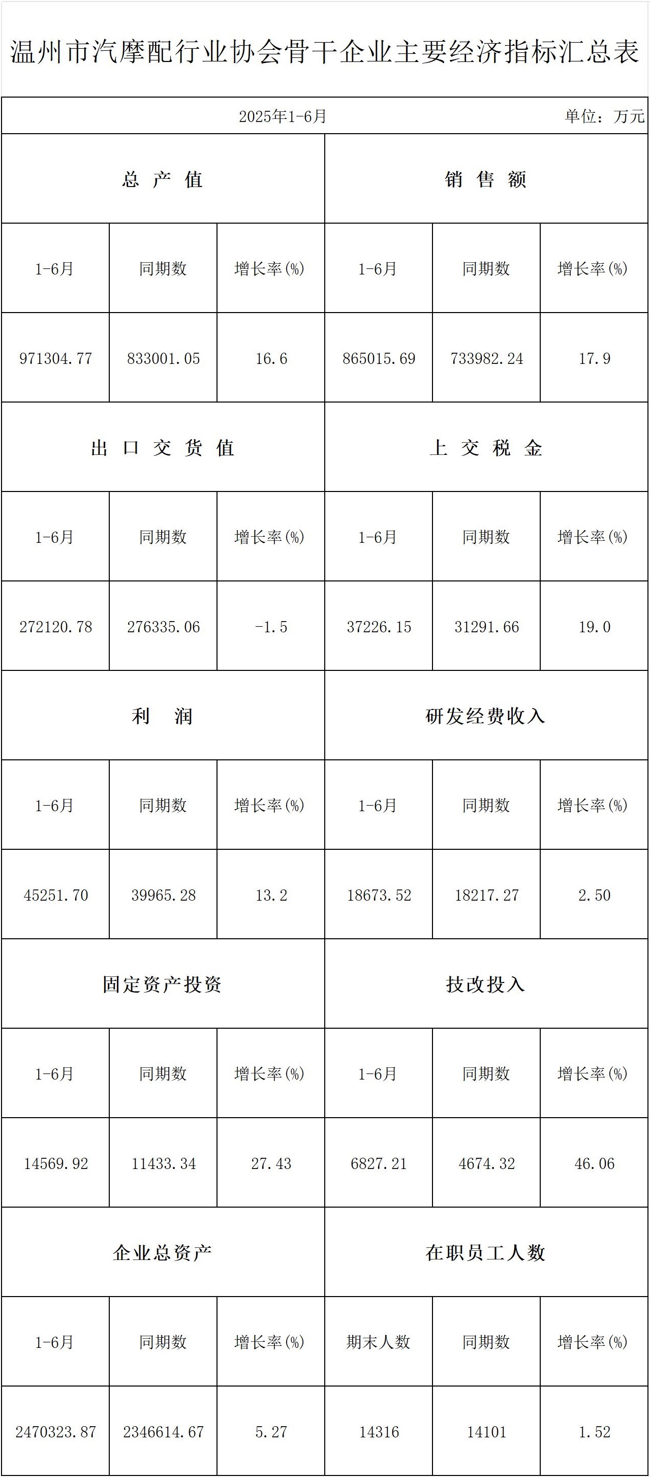 温州市汽摩配行业协会骨干企业主要经济指标汇总表(2025年二季度)